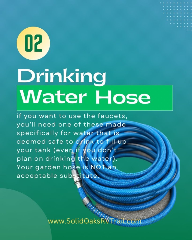 Drinking Water Hose: Could you use any old hose laying around? Yes, but a garden hose is not rated for potable (that means drinkable) water. Do you know what could be growing in it? Yuck. These drinking water hoses meet federal and state compliance for water consumption. As soon as you buy only a 25′ hose, you’ll realize you should’ve bought one much longer at the next campsite. The locations to fill your tank are not always equal. We’ve had to share water with other sites and use the full length of our 50′ hose to get to it. It all depends on if your water is on-site or at a fill station. We also have several other lengths of the white drinking water hose as well. Total combined we’ve gained over 125′ of hose through the years. Let’s be honest: There have been a few times when we ran out of water or parked before filling up at the fill station and had to stretch a LONG way to the next water pump. Water hoses can also be joined with water filters, water pressure regulators, and water filtration systems as well to keep the water the way you want it. We don’t currently have a full-rig water filtration system but we also don’t drink the water we fill up with at the campground.
