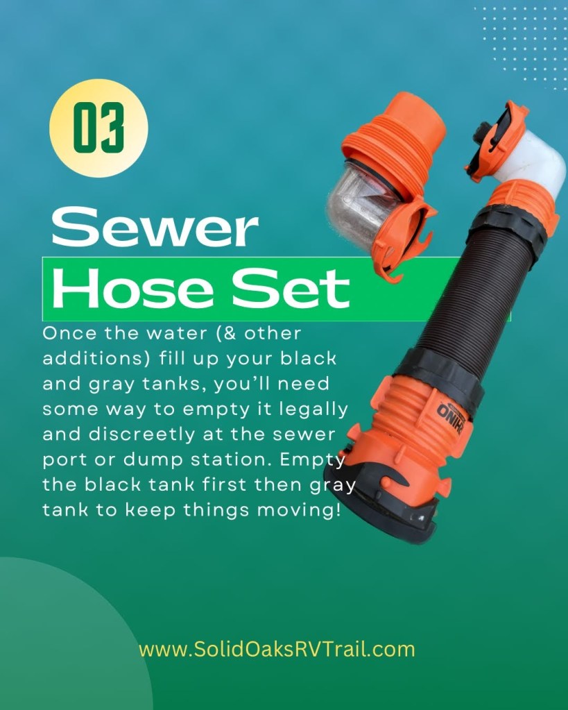 Sewer Hose: If you’re going to be using the water hose and filling up your tanks, you’re also going to need a way to get it back out at the dump station or sewer inlet if you have a full hookup (FHU) site. A sewer hose is not a place to go cheap unless you want to be the next star of the campground with some RV movie vibes. (If you don’t know what I’m talking about, watch the movie clip at the end of this post–of what NOT to do. Ha-ha.) We like the clear elbow so we can see when it’s finished. If you prefer FHU sites, then you should also have a donut to use to keep the area clean and free from smells for your neighbors. The linked product that we use has both the clear elbow and the donut. Keep your tanks closed until it’s time to leave or they are full whichever comes first. Open the black tank first then rinse with the gray water tanks. Also, rinse the hose with the non-potable water provided at the dump station or an old short water hose if you are at a FHU site. Plan where to store your sewer hose if your rig doesn’t have a place in the bumper or underneath already. It should never touch your fresh water hose or other items. We have a tube under our rig (or have made one in the past from vinyl fencing) to hold our hose when not in use. We also use a plastic storage tub for the extra pieces. Do you need sewer hose support? (It holds up the hose to keep it draining in the direction you want.) We’ve never owned one and have been fine, but if you are staying in FHU sites for a while, they could be nice. Most of the places we visit are electric or electric/water only with a dump station.