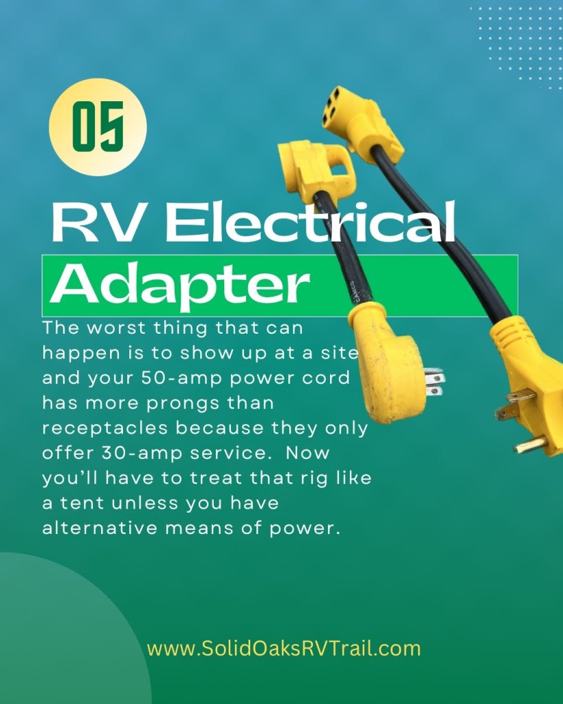 30-amp to 50-amp Adapter: This is also known as a dog bone in RV speak. No, this isn’t a toy for your pet. If you have a 50-amp plug because you have a fireplace and A/C or two A/C’s, then you need to have a way to take your 50-amp plug to a 30-amp plug that is at the majority of campgrounds–at least where we’ve stayed. If you’re only staying in full resorts they probably have 50 amps. You can’t run everything when you use a dog bone so you do have to be careful to not pull more than 30 amps. If you have a 30-amp plug, maybe you want a 30-amp to 20-amp RV adapter so you can connect to your home’s power to run lights or the refrigerator. Most people would probably say that this adapter needs to come after a surge protector, but we needed adapters long before we even thought to use a surge protector. Surge protectors can save your rig from power shortages but they do cost a lot of money. Maybe you need a few months to save up for this purchase and just need to get out on the road. On our last 3 rigs, we installed a Progressive Inline EMS (here’s the 30-amp version). It has saved us on a hot, Michigan July 4th holiday in a county park with low voltage–multiple years. In all of our years, we’ve only had issues at this same park unless we’ve lost power somewhere else, so the likelihood of needing a surge protector immediately is slim. I’ll be frank–our inline EMS is one of the FIRST things we install on our rig but when you have more to purchase and your pocketbook is thin, it can wait. An RV dealer will try to talk you into one right away and stress the importance of it, but it’s also a big-ticket item. If you can afford a surge protector of some kind right away, don’t delay. No one wants their rig fried because a campground doesn’t have the best power grid.